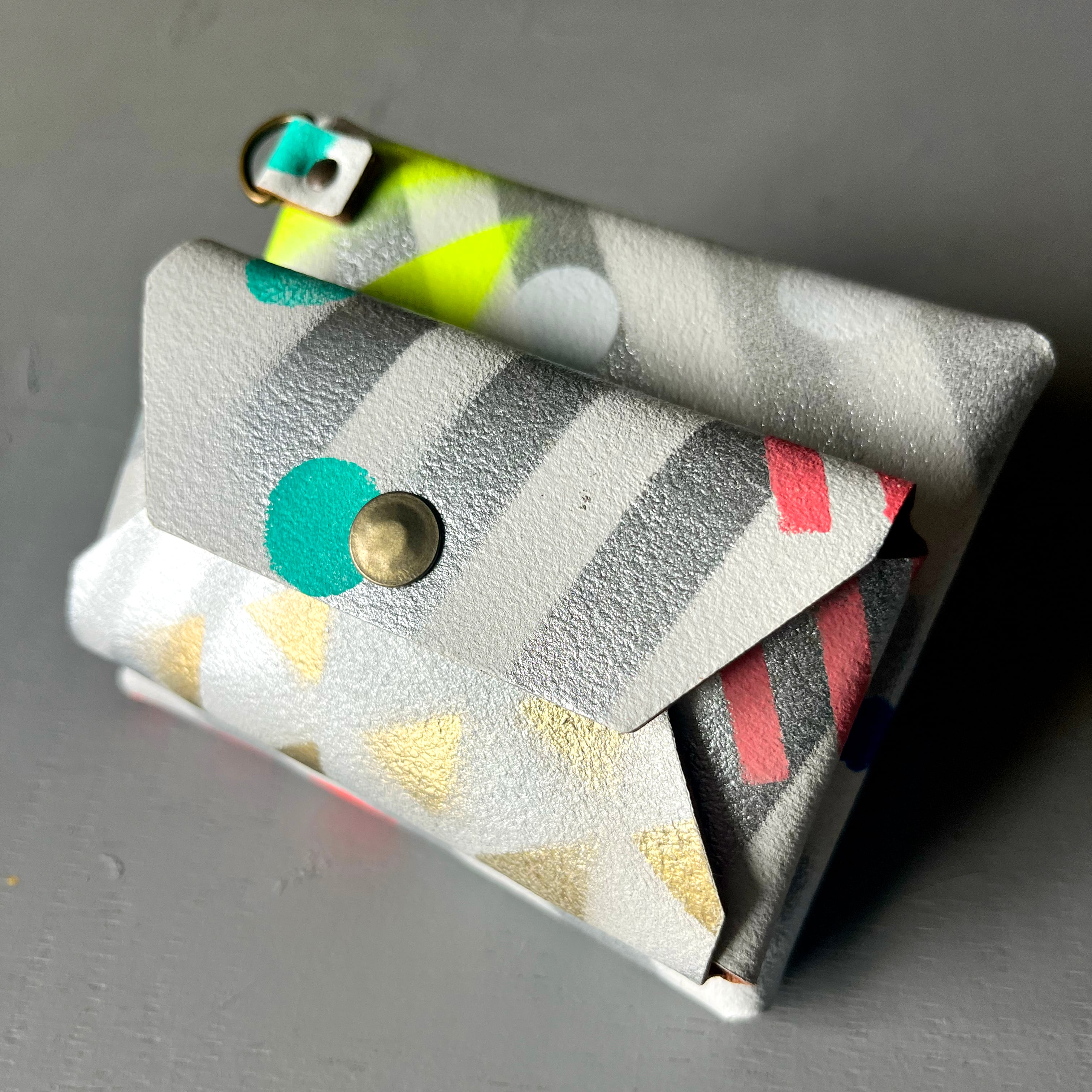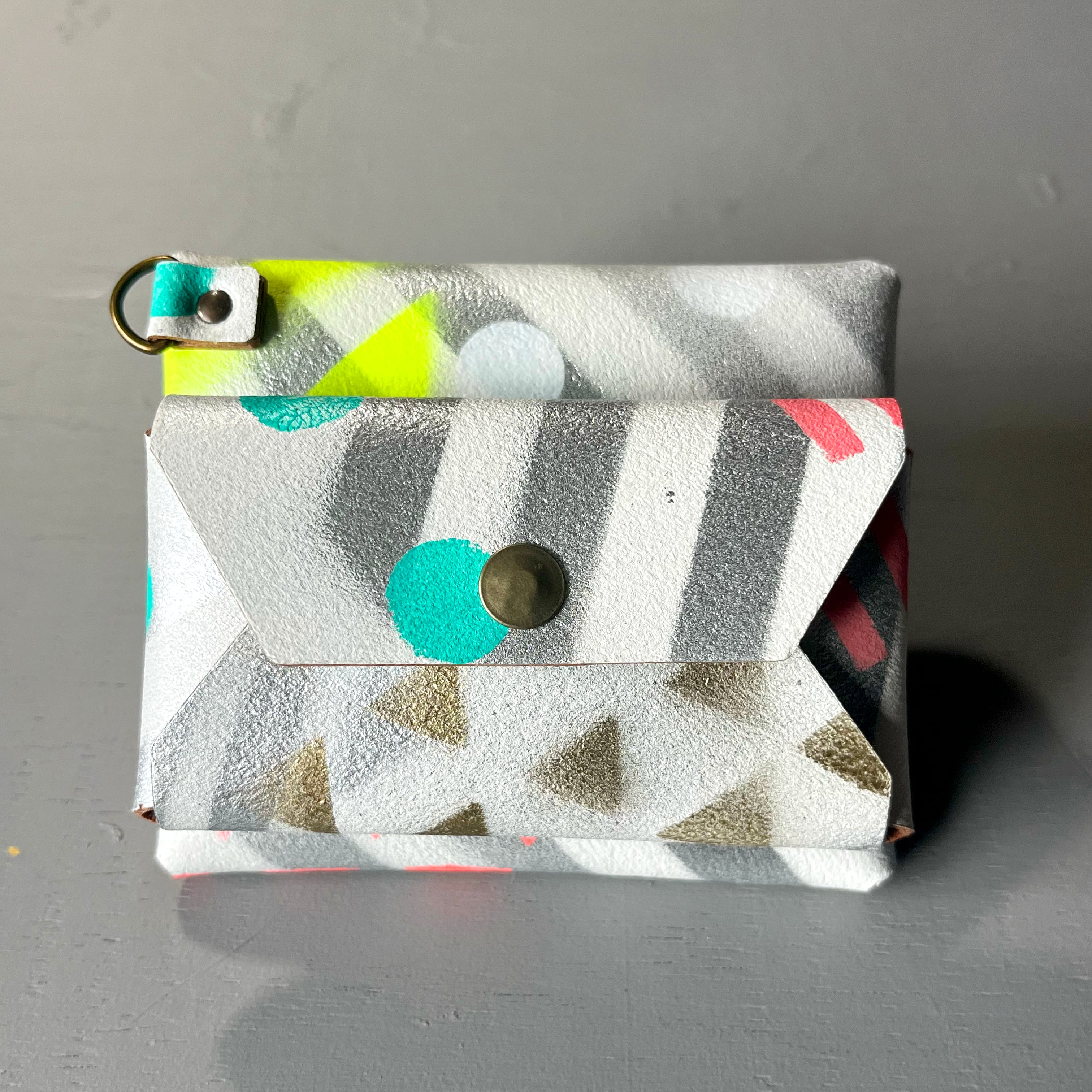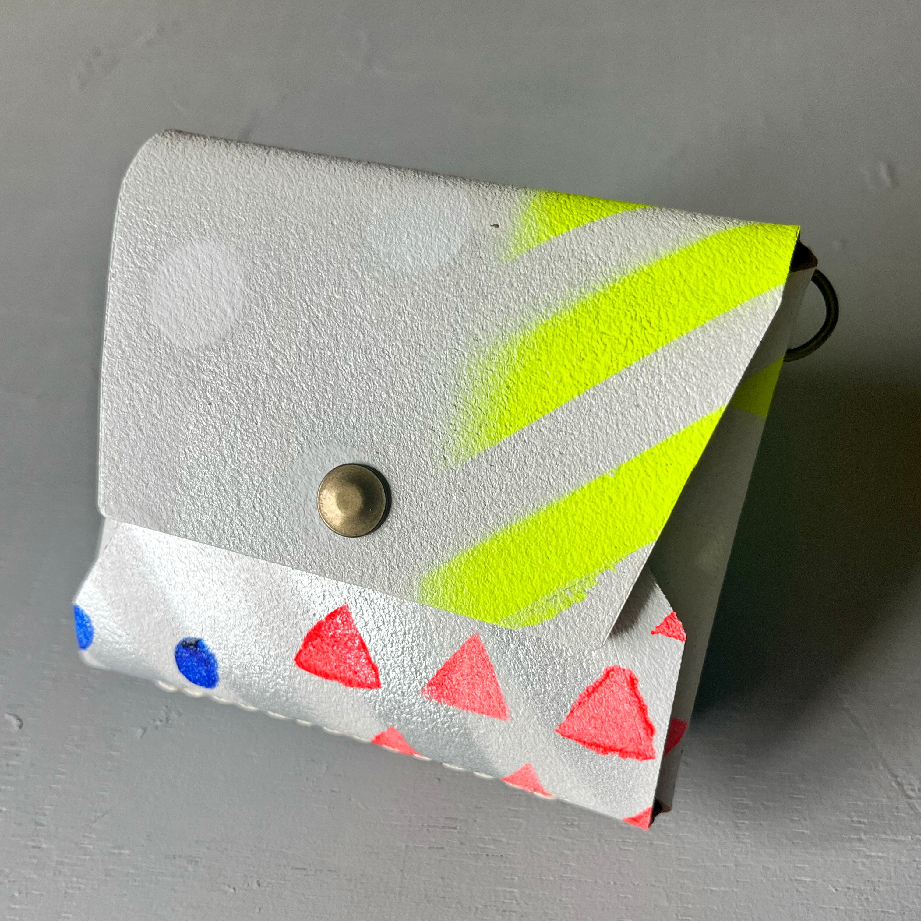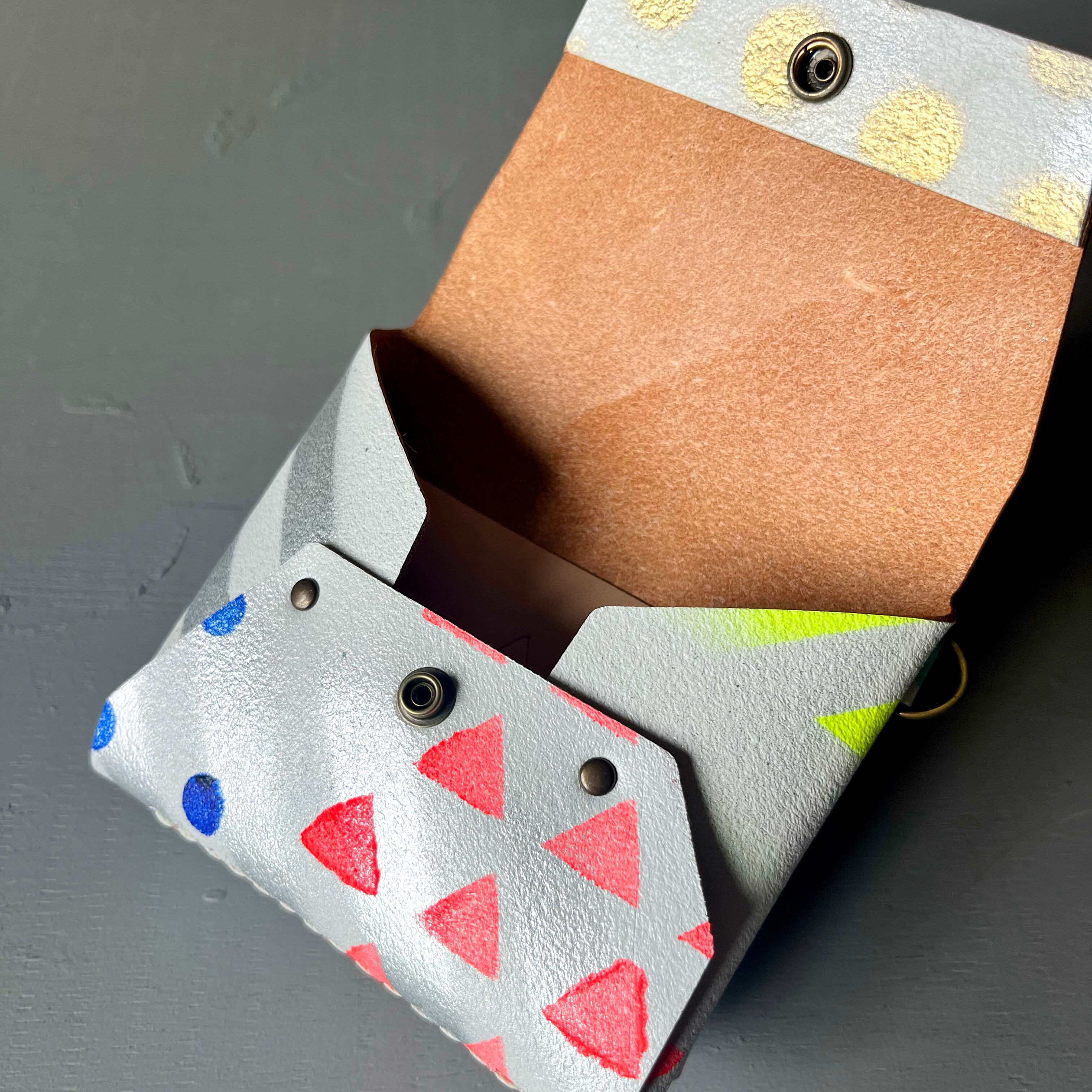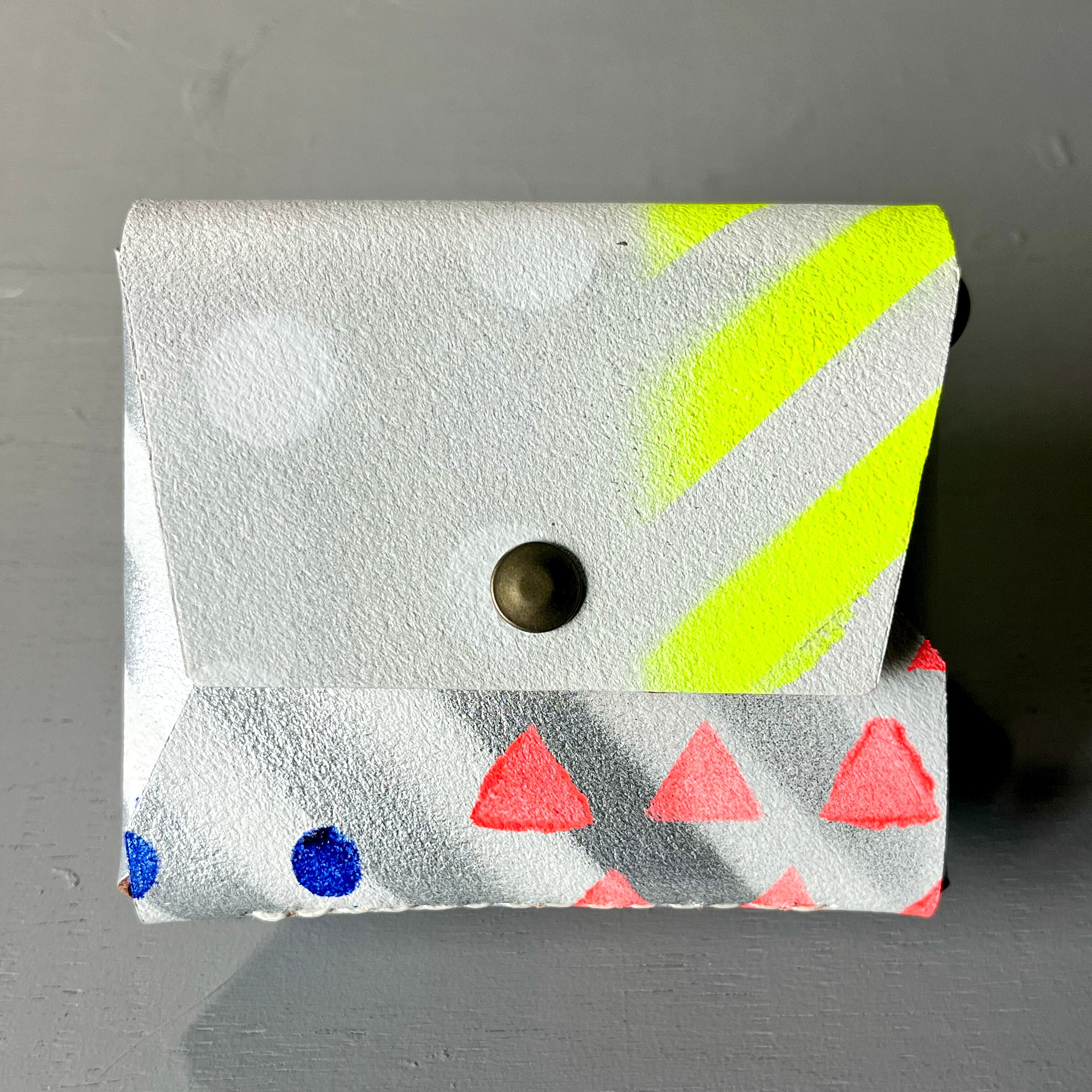 ホワイトペイントを施した床革に、さまざまな模様をステンシルで重ねた唯一無二の一点物です。